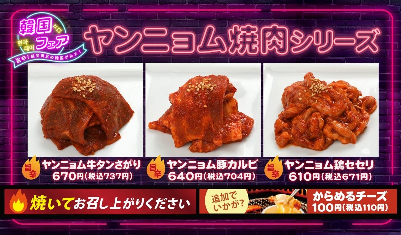 ■ヤンニョム牛タンさがり 税込737円 ■ヤンニョム豚カルビ 税込704円 ■ヤンニョム鶏セセリ 税込671円