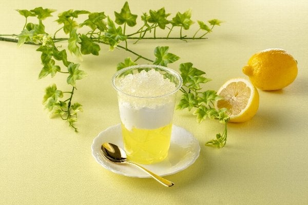 【商品特長】ジューシーな角切りレモンゼリーに、酸味のあるレモンムースを重ね、きらりと光るゼリーを飾りました。夏にぴったりな涼やかな見た目のパルフェです。