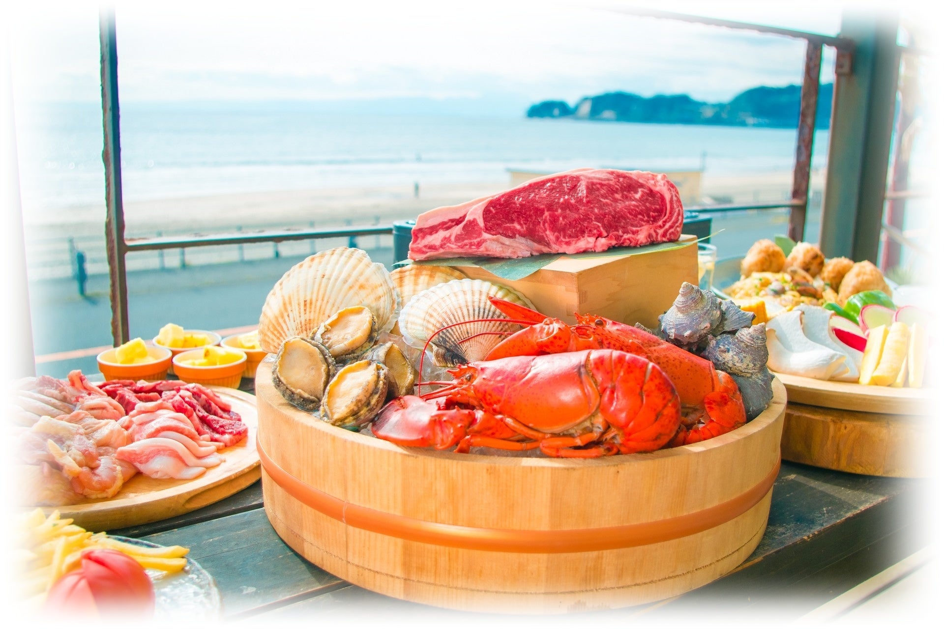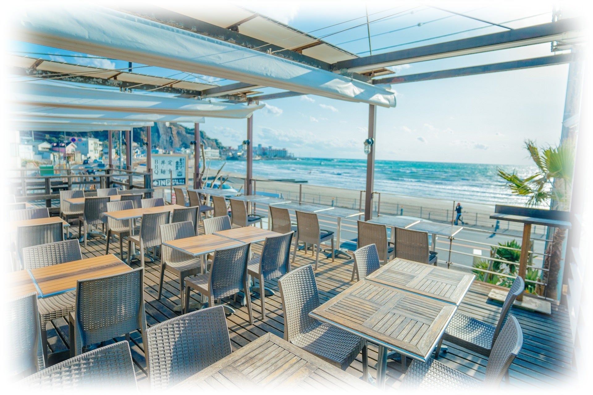 54席あるテラス席は、ゆったり座れるソファ席とテーブル席から選ぶことができるため、人数やシーンに合わせて使いやすいのが嬉しいポイント!材木座の海が目の前に広がる開放的な空間で、波の音をBGMにしながらBBQを楽しむことができます。昼間は海と空の青色のコントラストが美しく、夕暮れ時は沈む夕陽を眺めながらお食事いただけます。