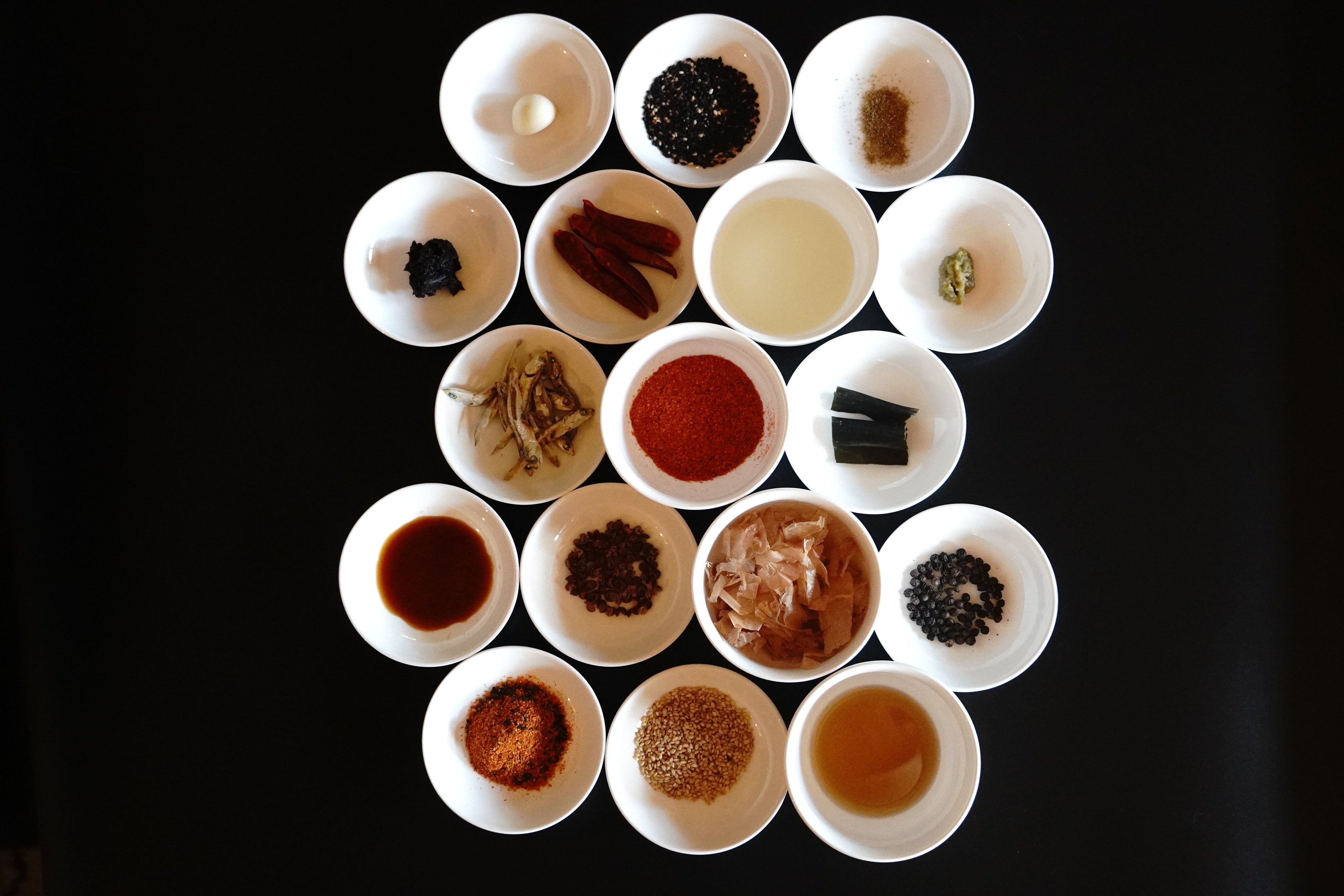 赤唐辛子、白ごま、黒ごま、ちんぴ、あおさ、けしの実、麻の実、山椒、酢、赤味噌、山葵、醤油、鰹節、煮干、塩、昆布、料理酒 |