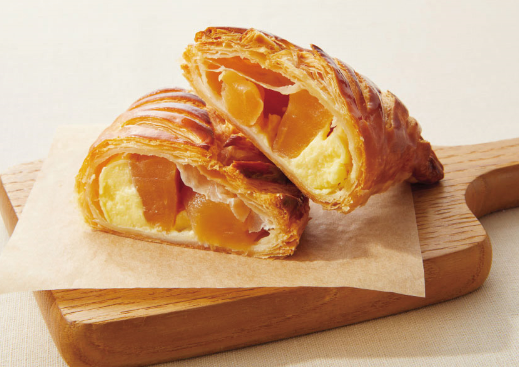 フランス産小麦を使用し、逆折(ぎゃくおり)製法のパイ生地に、ジューシーな国産りんご「ふじ」とカスタードクリームを包み、卵黄を二度塗りし店内で焼き上げました。