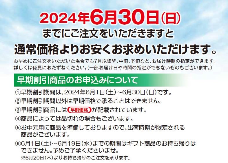 とってもお得な早期割引!お中元以外に御礼やお祝いにもご利用いただけます。