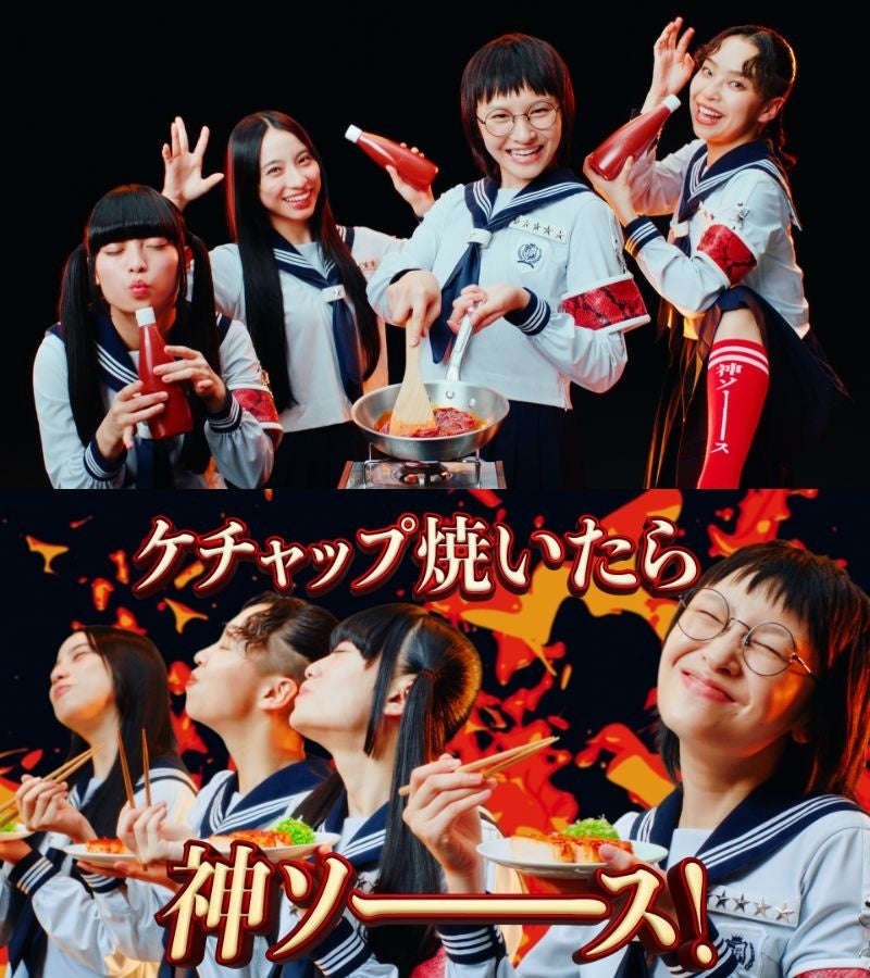 新しい学校のリーダーズが、トマトケチャップの新しい楽しみ方“焼きケチャップ”を提案。温めたフライパンで油とトマトケチャップをよく炒め合わせるだけで、より濃厚でコク深い味わいになり、トンテキなどの料理にもぴったりな“神ソース”になることをエネルギッシュに表現しています。本CMオリジナルの、新しい学校のリーダーズがはいている「神ソース」の赤いソックスにも注目です。