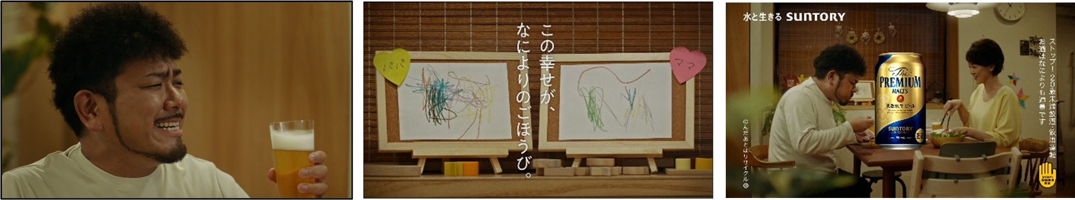 そんな慣れない父としての日々を自分なりに頑張っている新米パパが、「はじめての父の日」に子どもからは絵を、妻からは「ザ・プレミアム・モルツ」を貰い家族からねぎらわれます。少し遠い存在だった父の日が自分の日になったことを実感し、「ザ・プレミアム・モルツ」を飲みながら家族とごほうび時間を楽しみます。