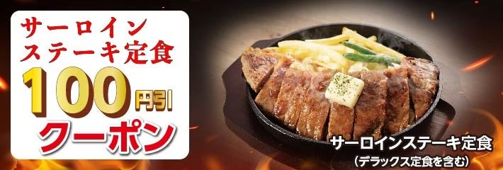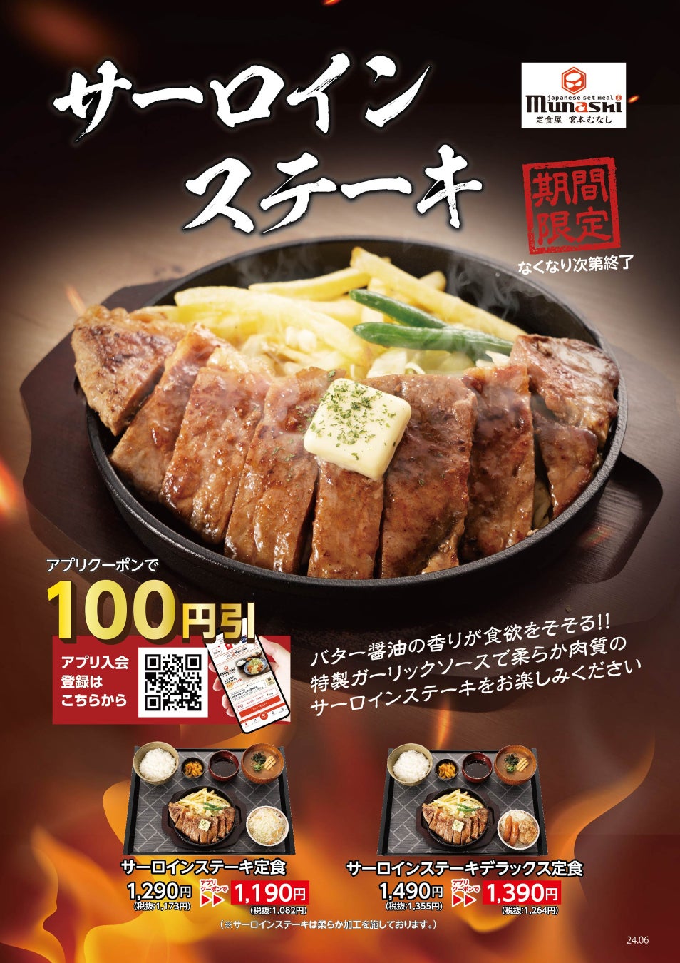 宮本むなし公式アプリでは、販売期間中に何度でも使える「サーロインステーキ定食各種100円引きクーポン」を配信いたします。会員の方限定でご利用いただけるクーポンですので、この機会にぜひ宮本むなし公式アプリをダウンロード&会員登録ください。