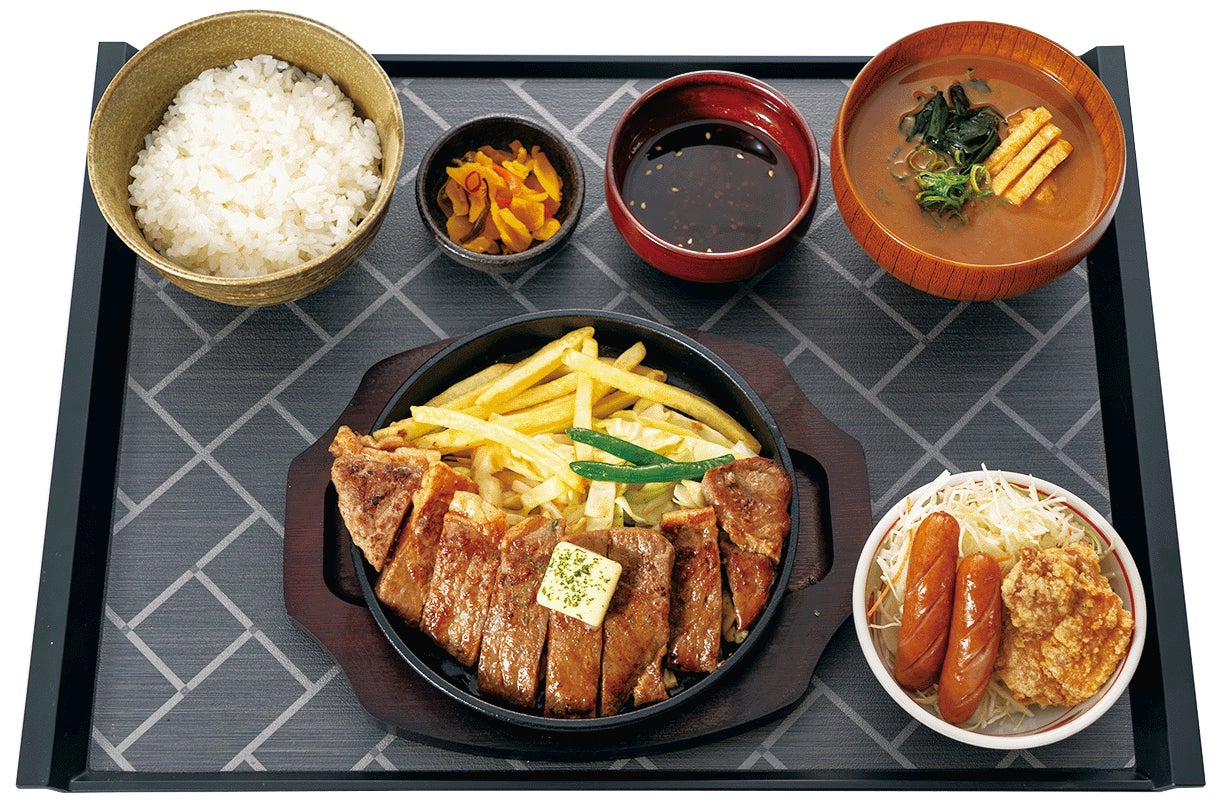 柔らかな肉質で脂の旨味がしっかりと感じられる「サーロインステーキ定食」のほか、さらにソーセージ2本と鶏の唐揚げ1個がセットになった「サーロインステーキデラックス定食」もご用意しました。