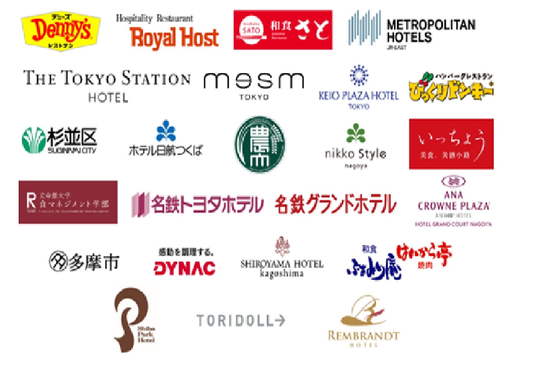 株式会社セブン&アイ・フードシステムズ、ロイヤルホールディングス株式会社、SRSホールディングス株式会社、日本ホテル株式会社、株式会社京王プラザホテル、株式会社アレフ、東京都杉並区、ホテル日航つくば、東京農業大学、ニッコースタイル名古屋、株式会社いっちょう、立命館大学食マネジメント学部、株式会社名鉄ホテルホールデイングス、東京都多摩市、株式会社ダイナック、城山観光株式会社、康正産業株式会社、株式会社芝パークホテル、blancjapan株式会社、株式会社トリドールホールディングス、レンブラントホテル