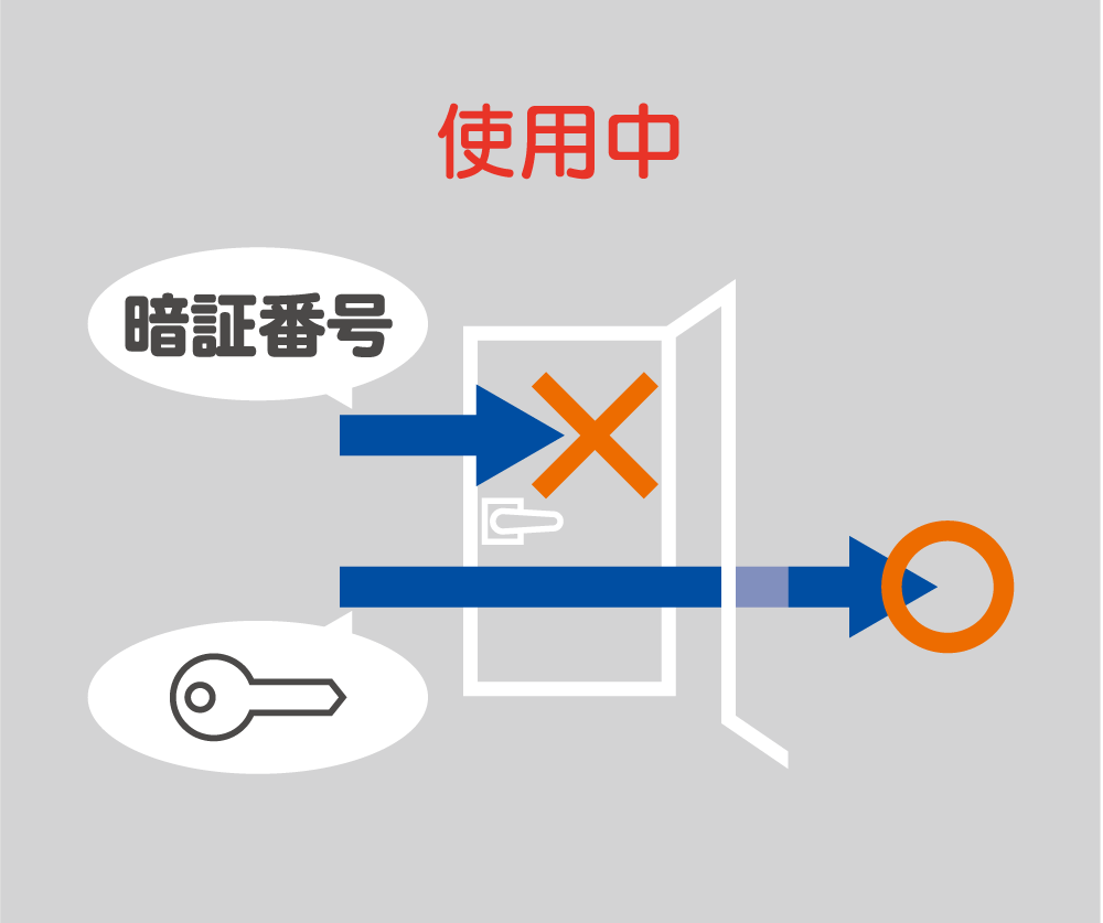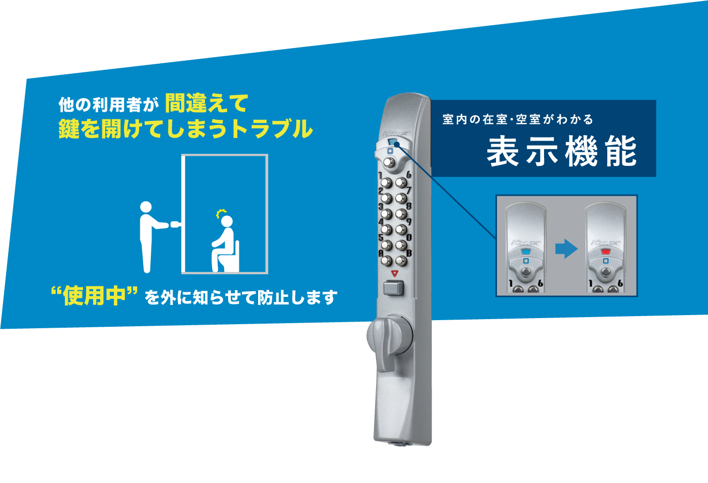 施設利用者以外にトイレを無断で使用されてしまうトラブルを防ぐ。さらに表示錠により“使用中を外にいる他の利用者に伝える”事と“使用中に他の利用者が外から間違えて開けてしまうトラブルを防ぐ”事が可能