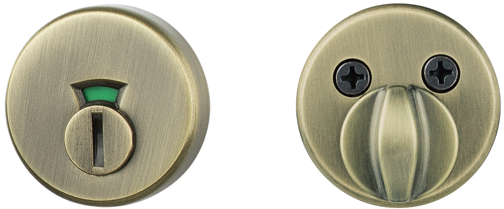室内側のサムターンを「Lock」の方向に回すことで室外側の表示が青色から赤色に切り替わり、「使用中」であることが一目でわかります。