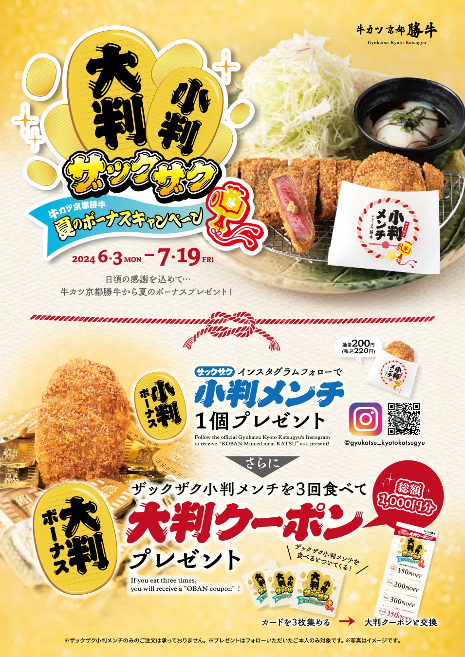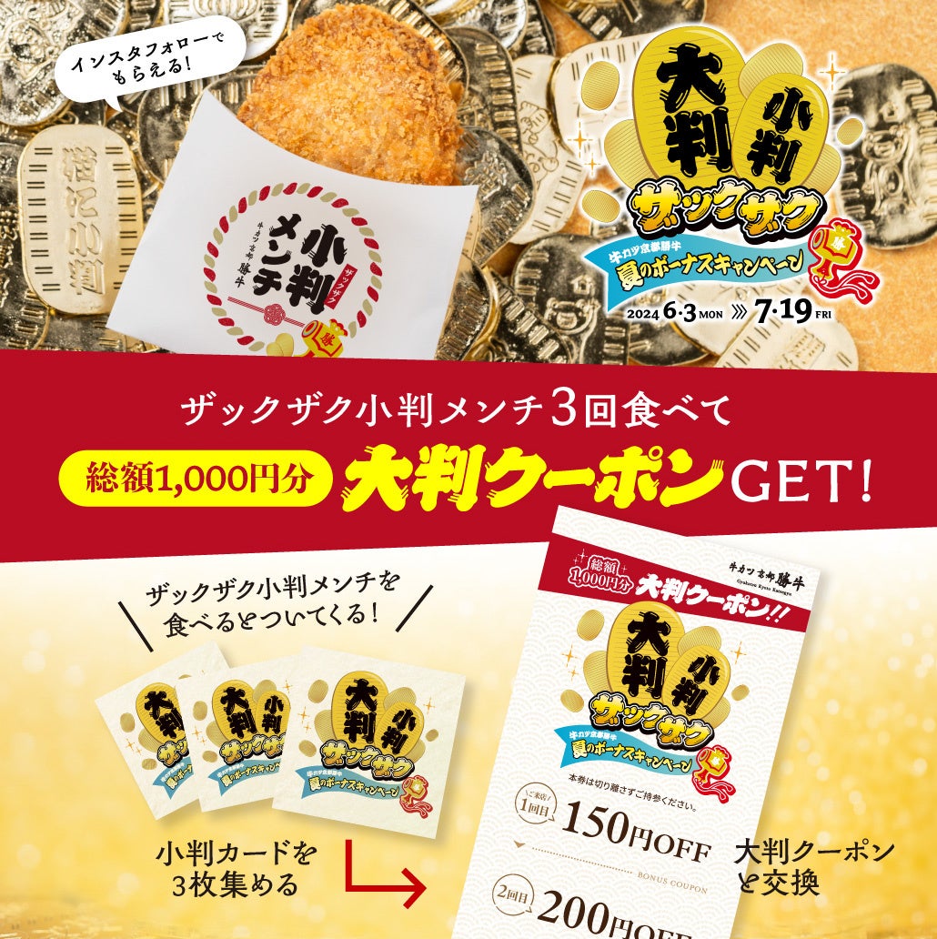 期間中に牛カツ京都勝牛の公式Instagramをフォローすると「ザックザク小判メンチ」を無料でプレゼント!さらに!「ザックザク小判メンチ」と一緒にお渡しする小判カードを3枚集めると、総額1,000円分の「大判クーポン」をもれなくプレゼント!