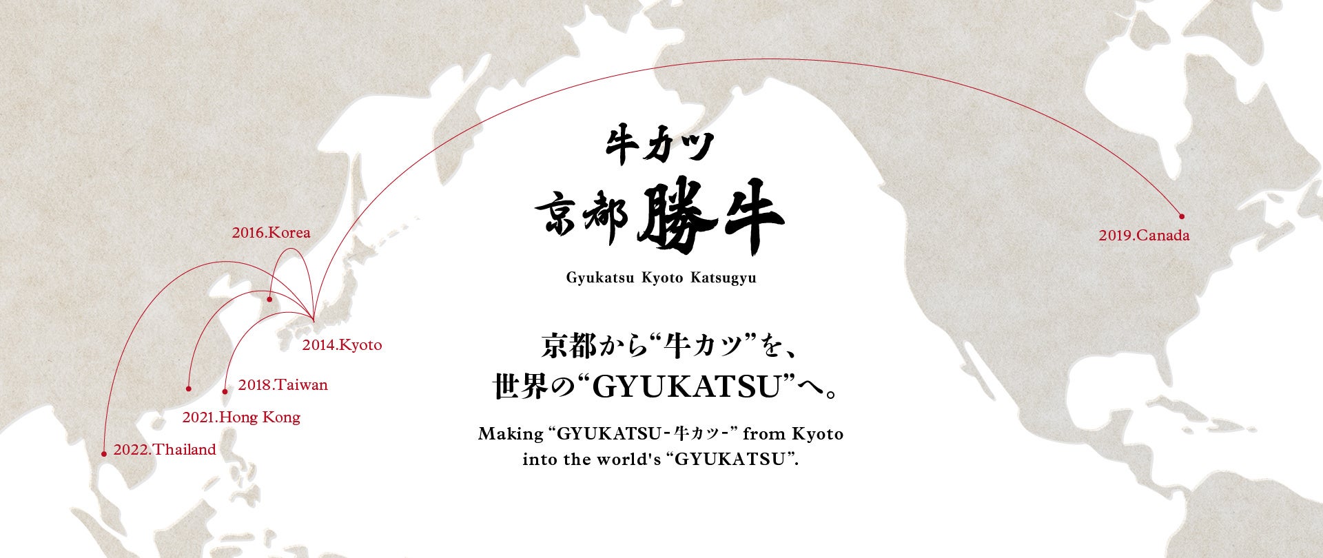 新たな日本食文化として海外でも大きな注目を集める「牛カツ-GYUKATSU-」を広めるべく、国内のみならず海外5ヵ国(韓国、台湾、香港、タイ、カナダ)に出店し、今後も世界を舞台に積極的に展開してまいります。