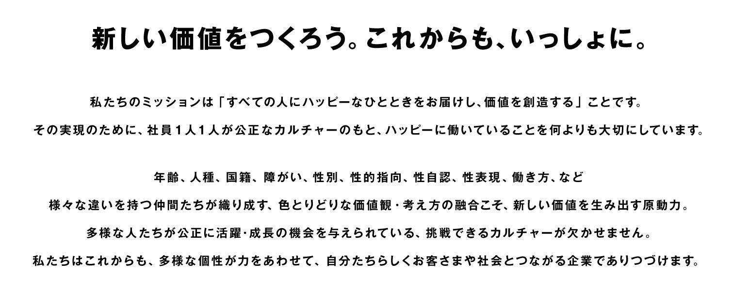 これらを通じて、年齢、人種、国籍、障がい、性別、性的指向、性自認、性表現、働き方などの多種多様な違いを持つメンバーがお互いの違いを尊重し、価値観や考え方を融合することで、新しい価値やイノベーションが生まれると信じています。違いに関わらず、すべての社員が自分らしく、能力を最大限発揮できるインクルーシブな環境の実現により、人的資本のさらなる強化を目指します。今後もミッションとして掲げる「すべての人にハッピーなひとときをお届けし、価値を創造する」ことで、持続的な成長・企業価値の向上に向けて前進してまいります。