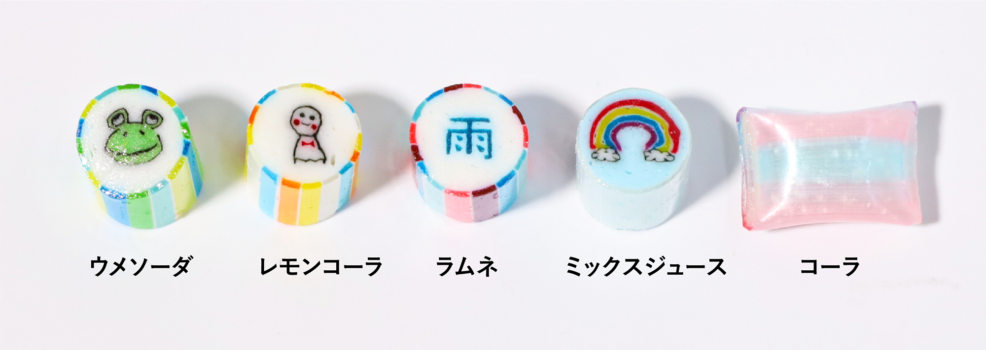 てるてる坊主や可愛いカエル、虹など、雨の日でも元気が出るような絵柄のキャンディミックスです。フレーバーはレモンコーラやラムネ、ミックスジュースなど、ジメジメ感を吹き飛ばすようなサッパリとしたドリンク系フレーバーで仕上げました。