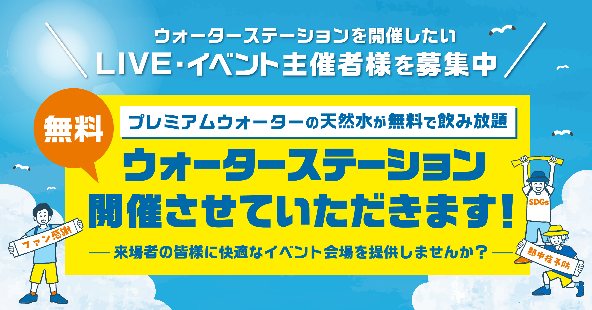 庭に提供しているプレミアムウォーター株式会社(所在地:東京都渋谷区、代表取締役社長:金本 彰彦)は、2024年6月3日(月)よりマイボトルやペットボトルご持参でプレミアムウォーターの天然水が無料で飲めるウォーターステーションを開催したいLIVE・イベント主催者様の募集を開始いたします。