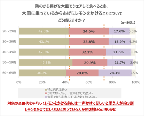 ・からあげを大皿でシェアして食べるときに、大皿に乗った状態のからあげにレモンをかけることについて、「特に抵抗はない」43.0%「かけてもいいが、一言声をかけて欲しい」31.4%(合計74.4%)と、多くの方は肯定的な見方をしていることも分かりました。