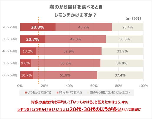 2016年に行った「からあげに何かける?」国民投票でもレモンは第1位(※2)に選ばれ、今回の調査でもからあげにレモンをかける方が多く、レモンはからあげのベストパートナーである事が確認できました。今回の調査では、からあげにレモンを「いつもかけて食べる」全世代平均は15.4%でしたが、「いつもかけて食べる」20代28.8%、30代20.7%となり、若い世代の方が数値が高い傾向になりました。レモンは揚げ物をさっぱりさせてくれるため、幅広い世代に親しまれている実態が分かりました。