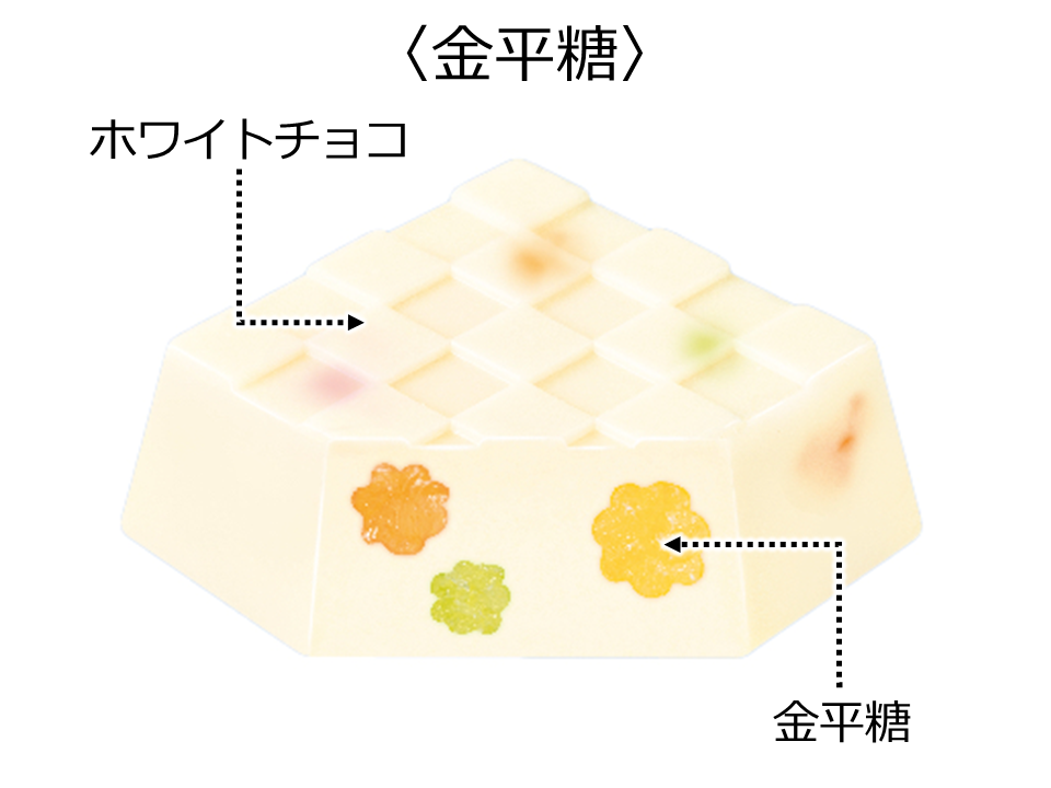 金平糖をホワイトチョコの中に詰め込み、噛んだときの“カリカリ感”がクセになる楽しい食感に仕上げました。