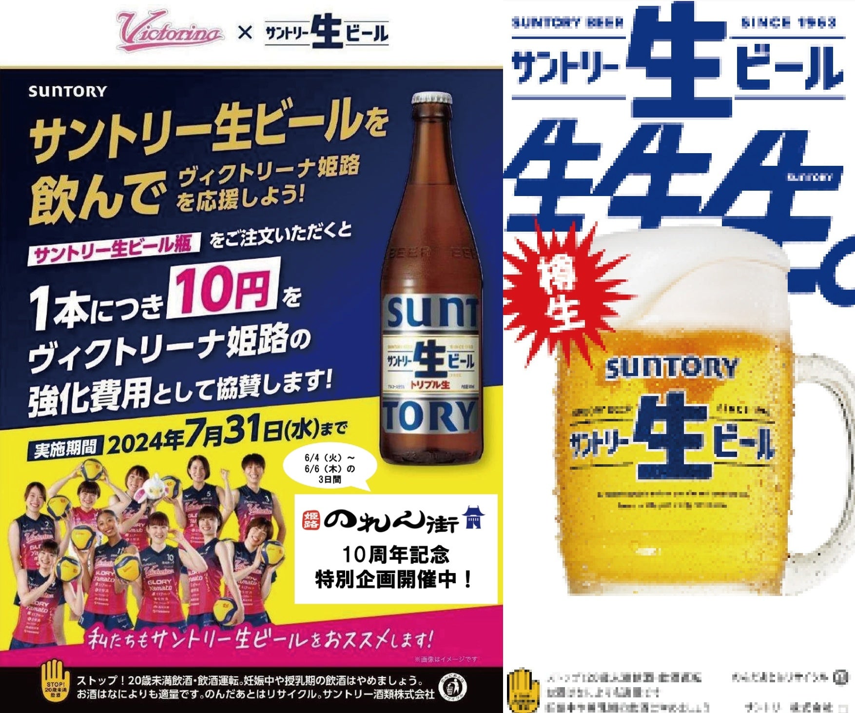 また6/4(火)〜6/6(木)の3日間、サントリー生ビール・中瓶をご注文いただくとなんとヴィクトリーナ姫路の選手と乾杯ができます。