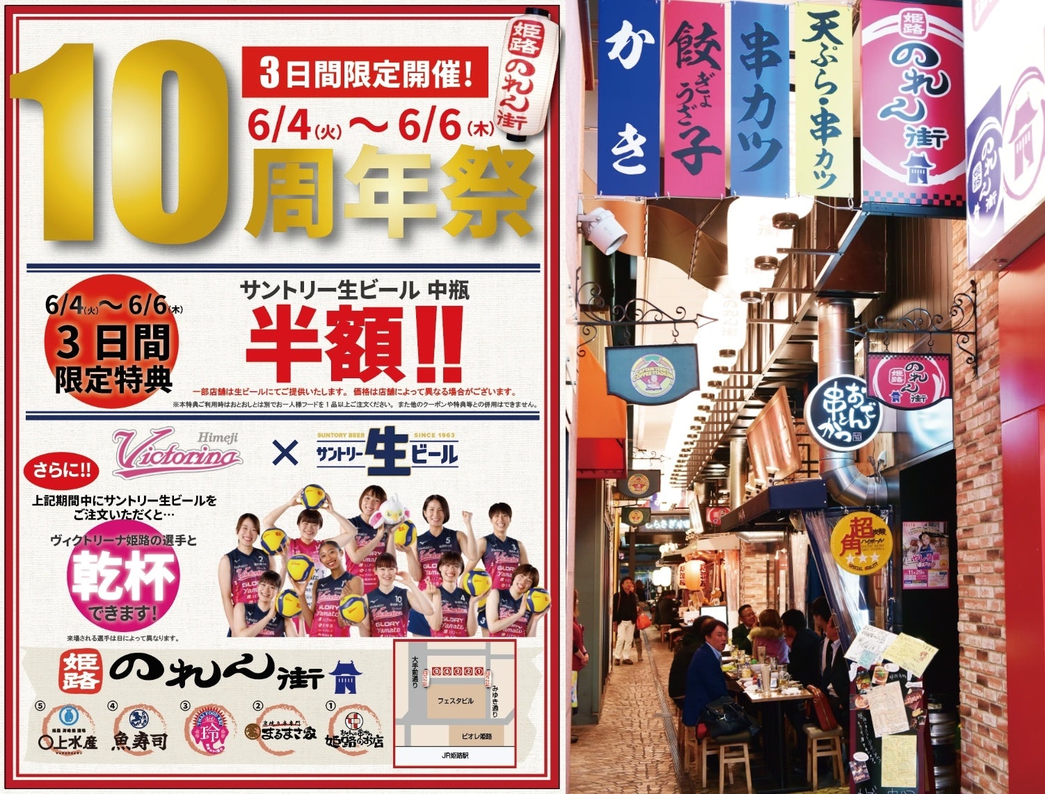 お得に呑める3日間!!サントリー生ビール・中瓶を呑んで姫路のれん街を楽しみながらヴィクトリーナ姫路を応援しよう!!