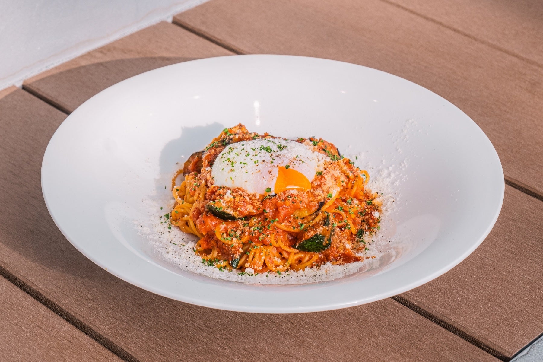 2.ZENBヌードルで初夏の野菜のトマトソースパスタ、うちゅうの夜明けたまご添え