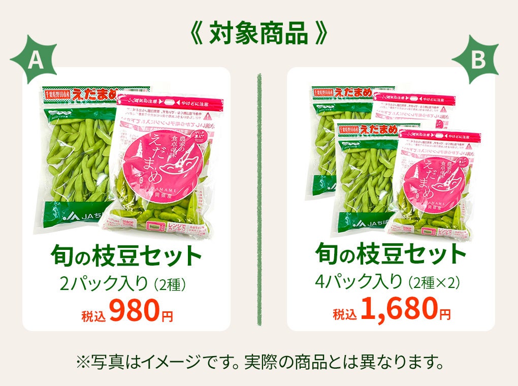 A. 旬の枝豆セット2パック入り(2種) B.旬の枝豆セット4パック入り(2種×2) |
