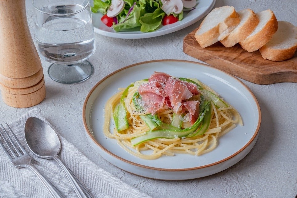 ・アスパラガスはピーラーで下部の皮を剥き、スライサーで薄切りにする。