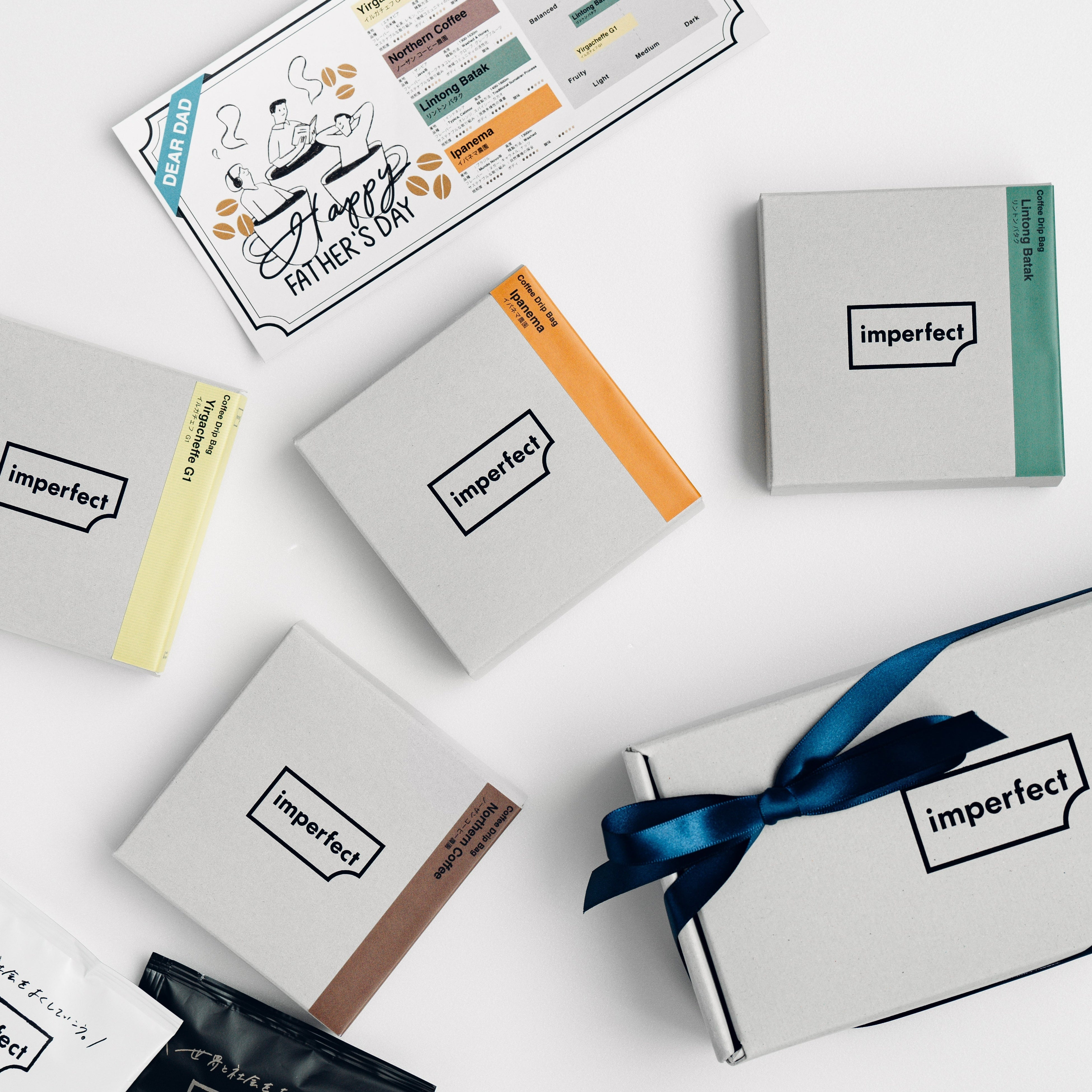 imperfectが厳選した4種のドリップバッグを楽しめるコーヒーギフト。産地や精製方法によって味わいの異なるコーヒーの奥深さを、お手軽に飲み比べて体感でき、コーヒー好きの方や新しいコーヒーとの出会いを求めている方にもぴったりです。父の日限定デザインの各コーヒーの違いが分かるコーヒーマップカード付きです。