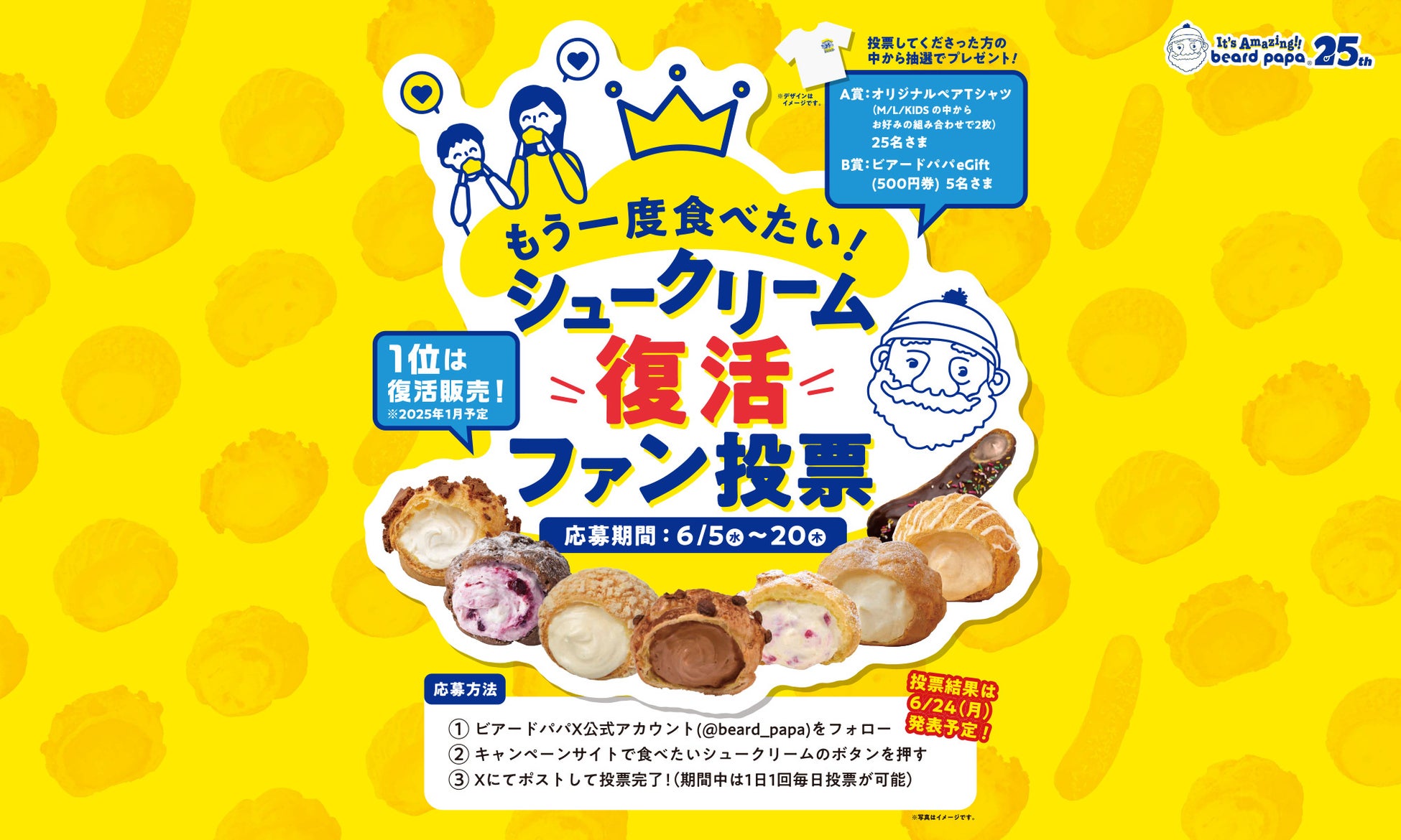 株式会社DAY TO LIFE(本社:大阪府大阪市北区、代表取締役:杉内健吉)が運営するシュークリーム専門店ビアードパパが、25周年を記念したイベント“シュークリーム復活ファン投票”を2024年6月5日(水)より開催いたします。