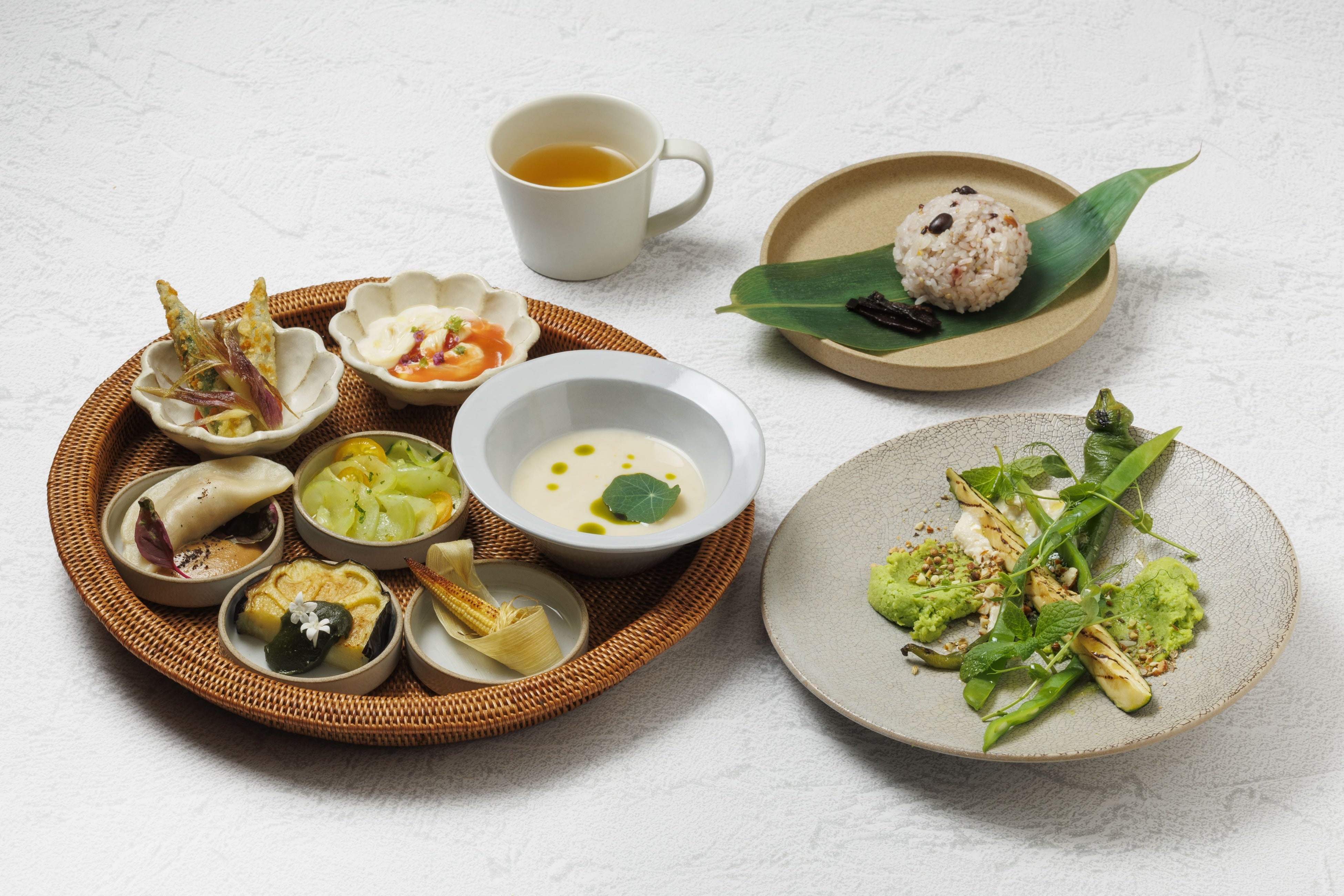 小鉢に盛り付けたおかずは、一皿ずつ京の食材を取り入れ、和食の趣を感じさせながらも、アジア料理や西洋料理との絶妙な組み合わせを楽しむことができます。まるでカプレーゼのような濃厚さと爽やかさを感じる汲み上げ湯葉 トマトの擦り流しや、抹茶を加えた味噌と京都産加茂茄子の田楽、瓜の爽やかな酢橘などが楽しめます。また、野菜の皮を煮詰めたベースをポタージュにした野菜を余すことなく使い切る「サスティナスープ」がつきます。