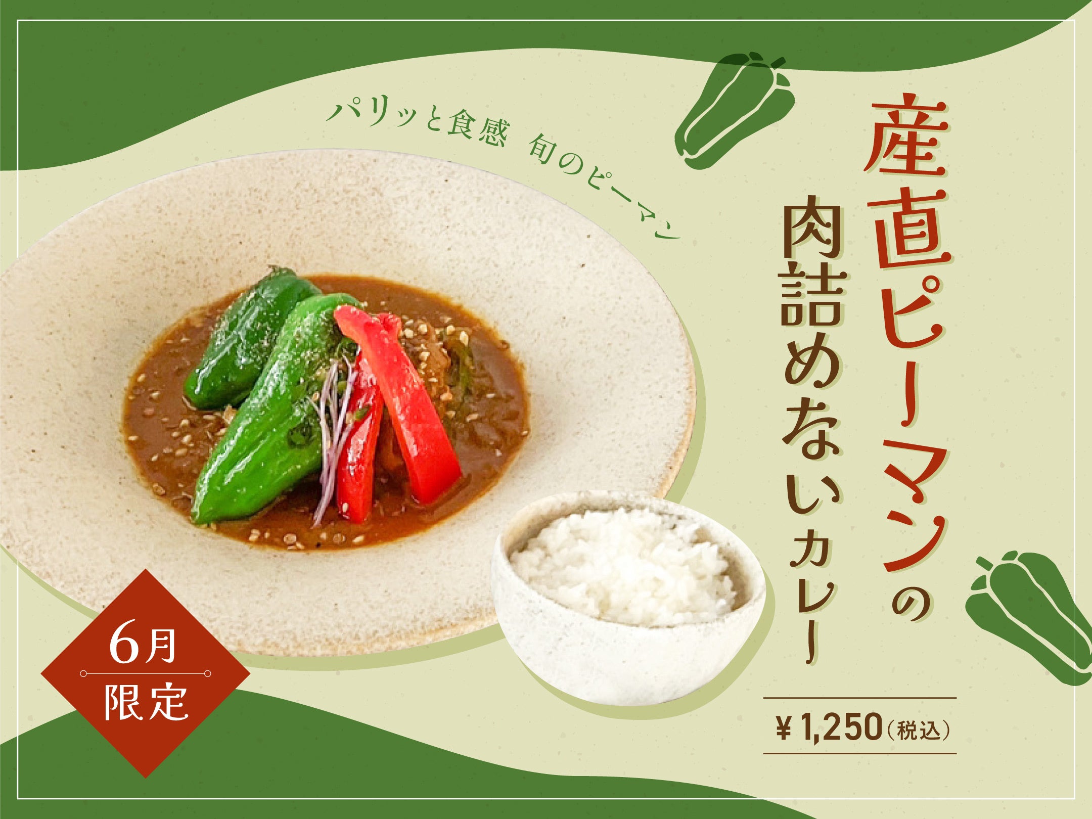今が旬のピーマンのフレッシュでパリッとした食感と味わいを楽しんでもらうため、あえて肉を詰めずに提供することにこだわりました。採れたてのピーマンが届きますので、その日によって産地が変わります。