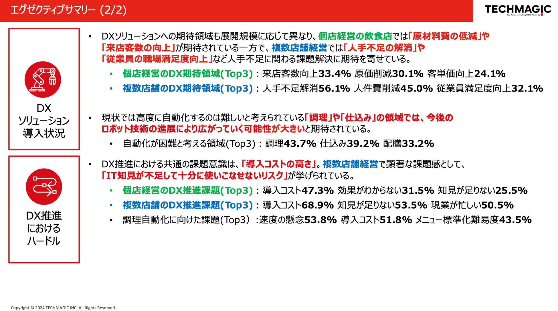 本レポートはご希望の方に無償でお送りさせていただくと共に、今後、定期的にアンケートを実施し、レポートを配信することで、食産業に関わる方々に有益な情報を提供し、少しでも食産業の効率化や問題解決に貢献してまいりたい考えです。また、テックマジックは社としても、本レポートの結果を通して改めて浮き彫りになった課題を参考にし、少しでも改善・解決の一助となれるよう、より一層、ヒトの能力を拡張するロボットソリューションの開発に努めてまいります。