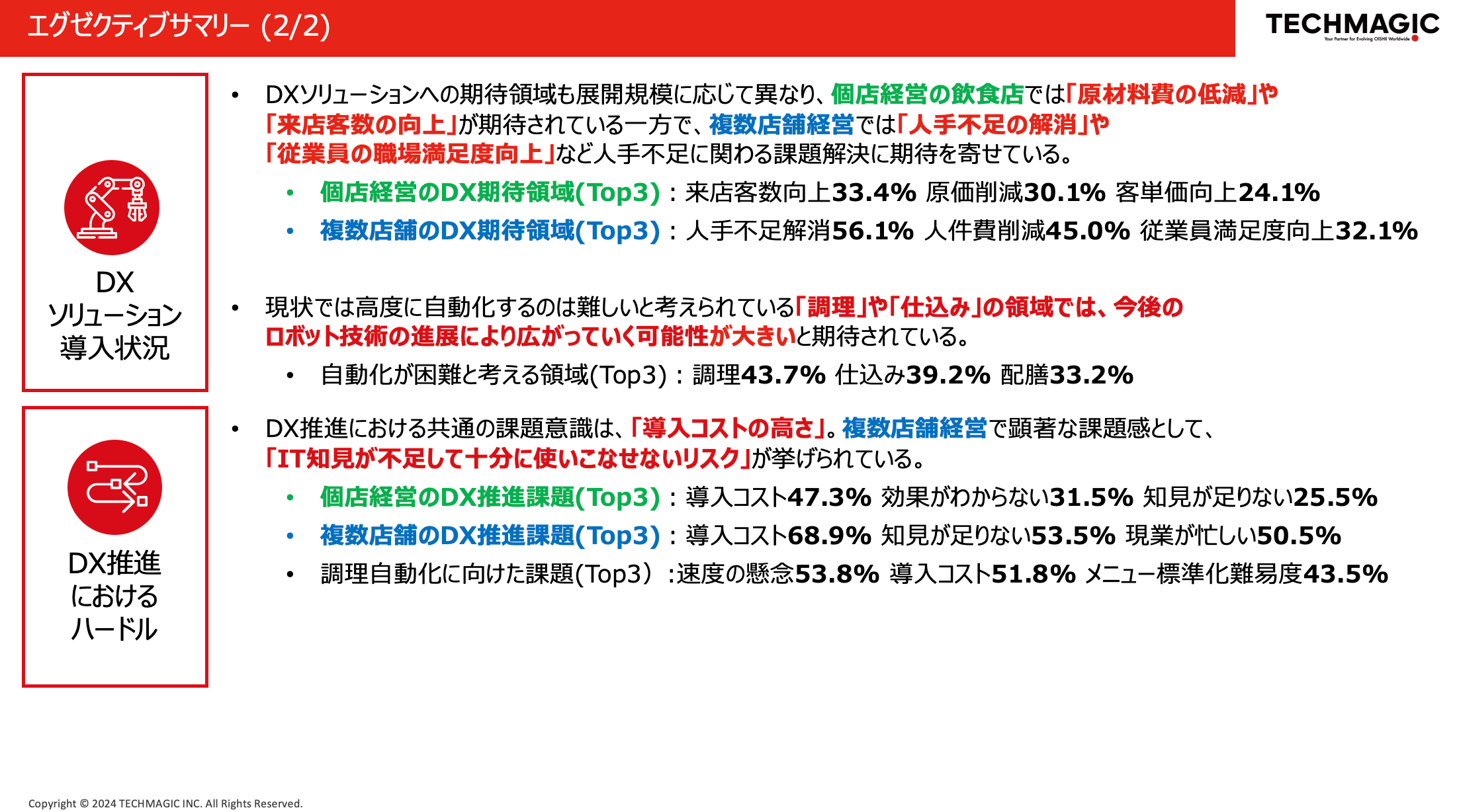 本レポートはご希望の方に無償でお送りさせていただくと共に、今後、定期的にアンケートを実施し、レポートを配信することで、食産業に関わる方々に有益な情報を提供し、少しでも食産業の効率化や問題解決に貢献してまいりたい考えです。また、テックマジックは社としても、本レポートの結果を通して改めて浮き彫りになった課題を参考にし、少しでも改善・解決の一助となれるよう、より一層、ヒトの能力を拡張するロボットソリューションの開発に努めてまいります。