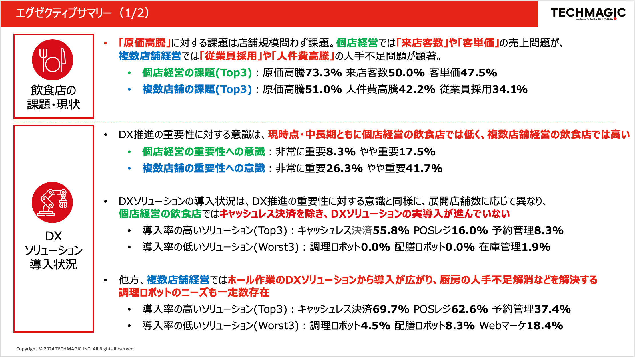 本レポートは2024年5月に国内飲食店の店長/マネージャー602名に対するアンケート調査の実施をした上、回答を分析し、対象者が抱える課題やDX(デジタル技術を活用した効率化・自動化)推進に対する現状や姿勢をまとめたものになります。アンケートを通じて、飲食業界の課題は展開店舗数により異なり、昨今の情勢を踏まえた「原価高騰」への課題感に加え、個店経営企業では「来店客数」「客単価」など売上に関する課題が、一方で、複数店舗経営企業では、「従業員採用」「人件費」など人手不足に関する課題が顕著に表れました。