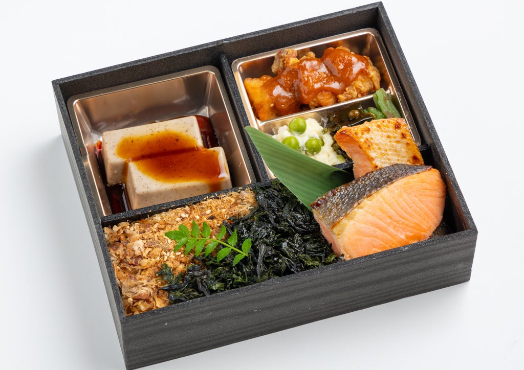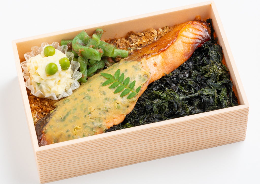 和の鉄人、道場六三郎のこだわりをお弁当でお楽しみいただけます。しっとりした食感の鮭には山椒の香りを効かせた味噌を乗せて焼き上げました。