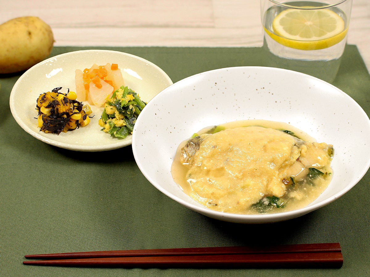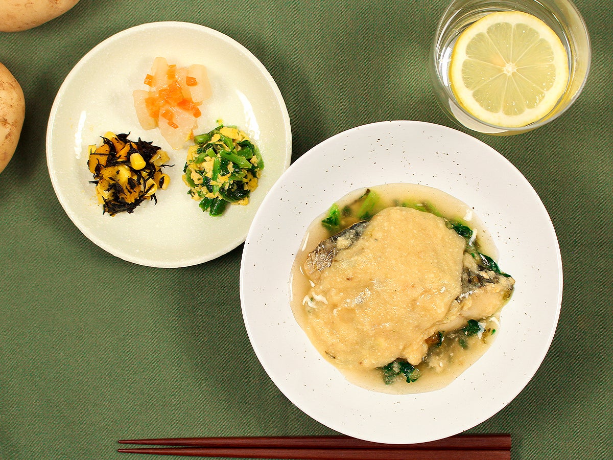 副菜は、かぼちゃとコーンの入ったひじき煮、大根のみぞれがけ、菜の花のからしマヨです。