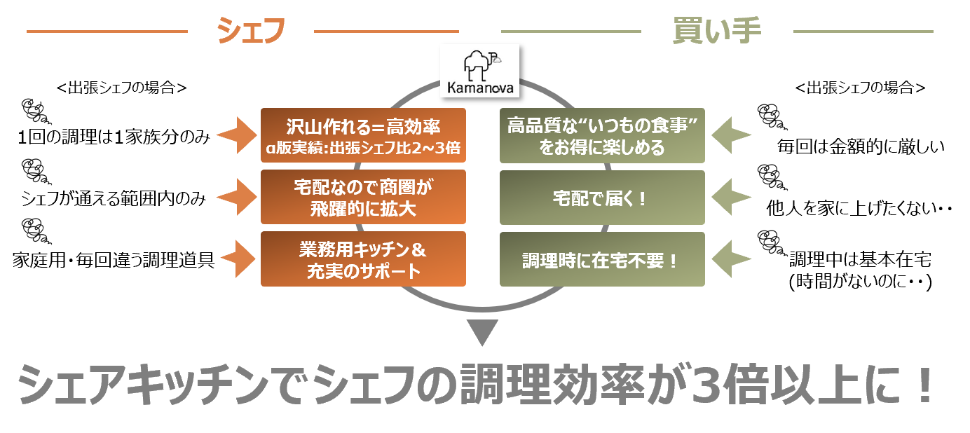 通常の出張シェフだと、シェフは訪問したご家庭の分しか料理を作ることができませんが、Kamanovaを利用することで、2~3家族分以上の分量を、1回の調理で作ることができます。利用者はリーズナブルに高品質な食事を楽しめ、シェフも同じ調理時間で、よりたくさんの収入を得ることができます。