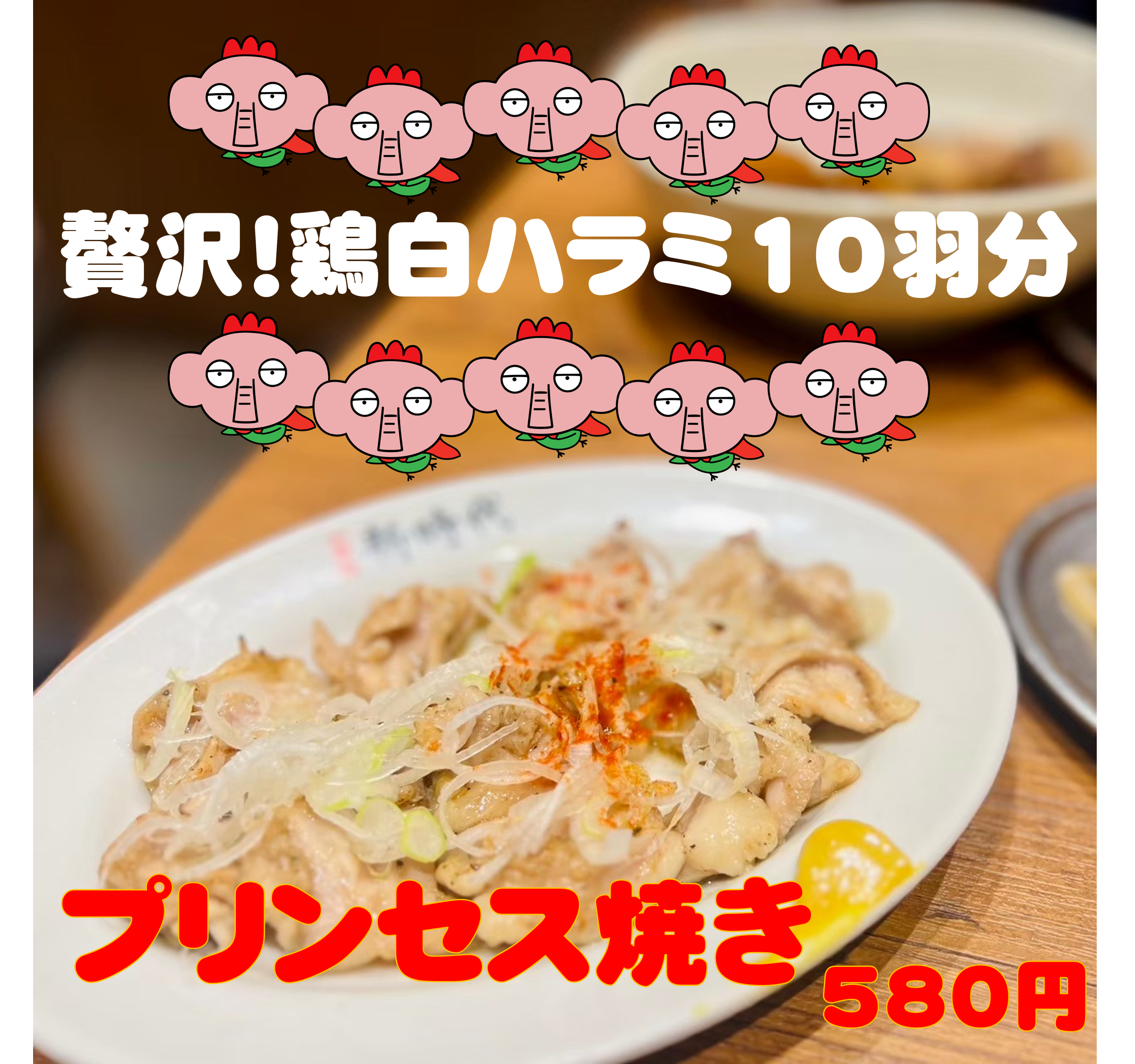 ・贅沢に鶏8羽分の白ハラミを使用『プリンセス焼き』580円