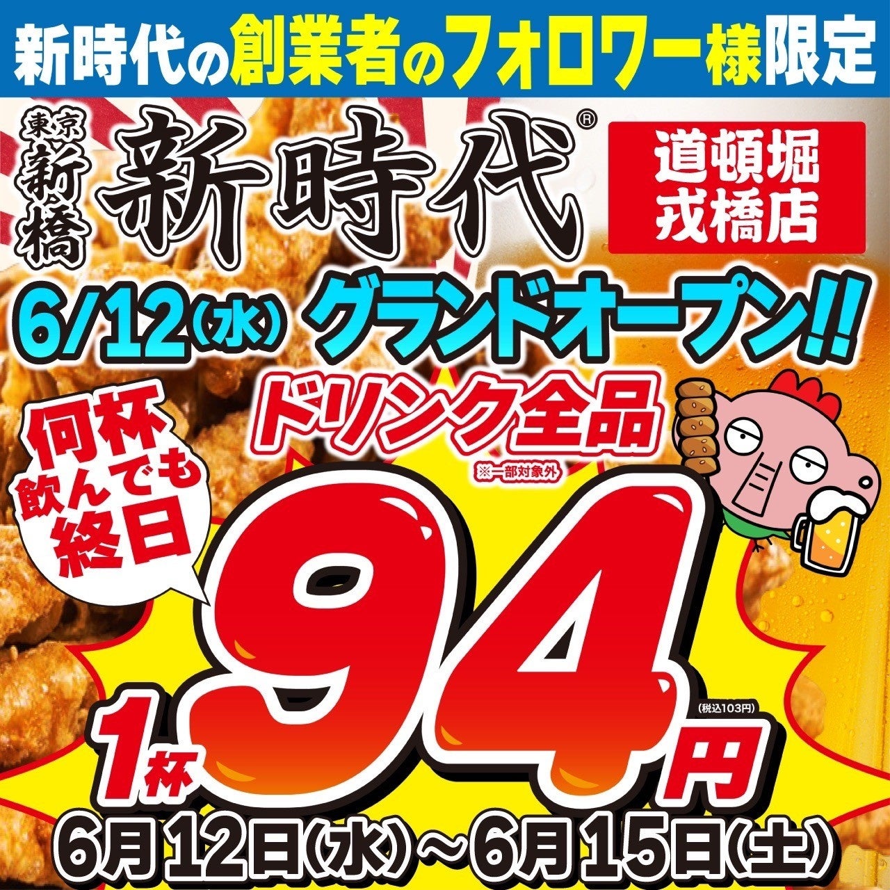 「新時代 道頓堀戎橋店」のオープンを記念し、ドリンク全品94円(税別)キャンペーンを開催します。
