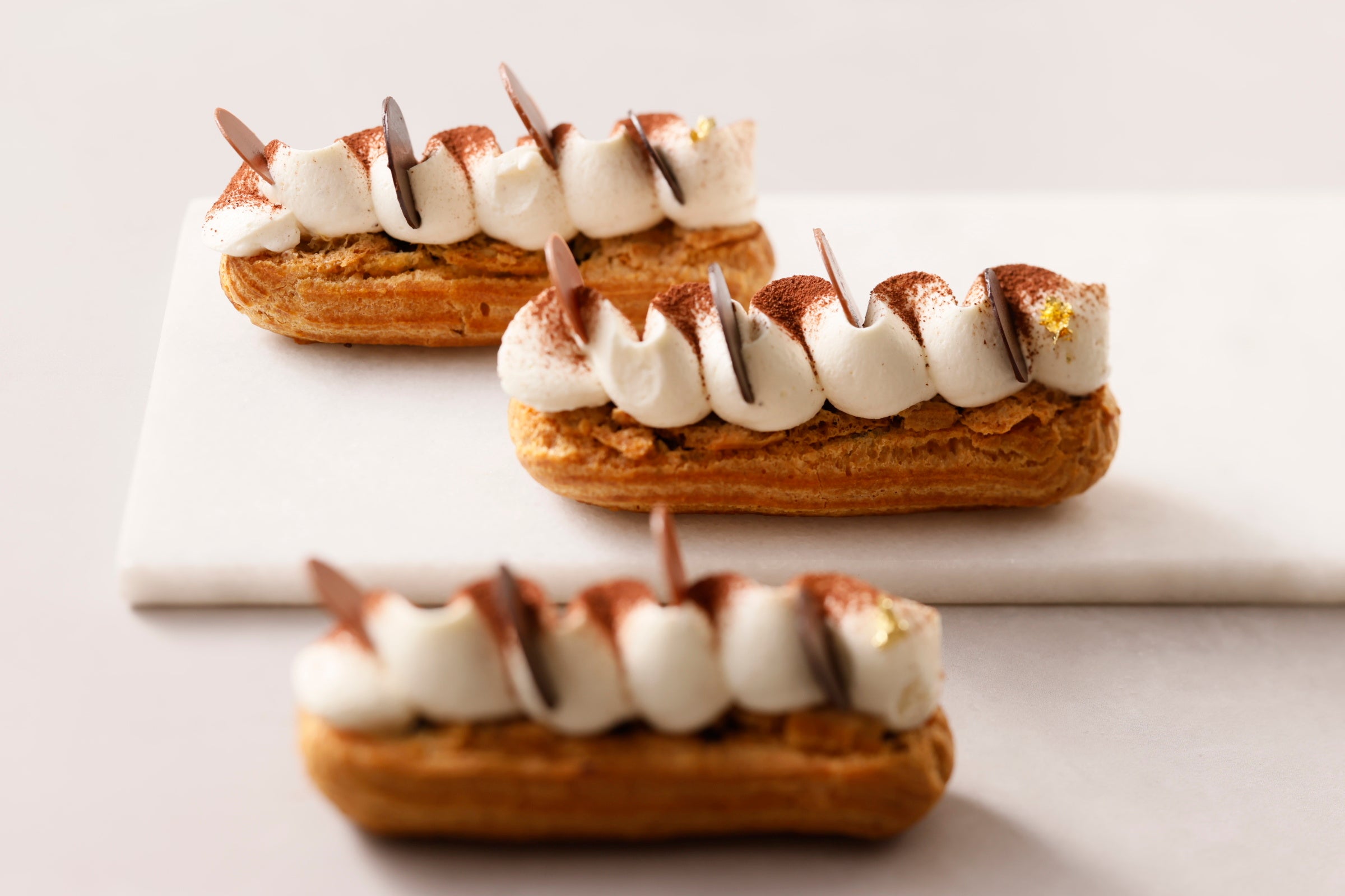 エクレアの中にはキャラメルチップとココアクッキー、エスプレッソ香るコーヒーシロップとマスカルポーネムースが入り、上部はマスカルポーネを使用した生クリームで仕上げています。