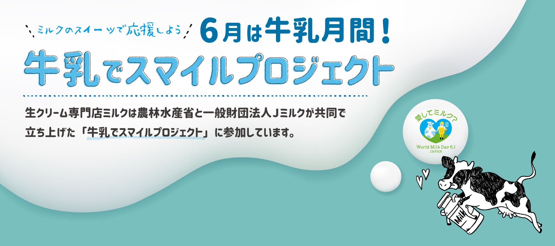 生クリーム専門店ミルクは農林水産省と一般社団法人Jミルクが立ち上げた「牛乳でスマイルプロジェクト」に参加しています。この取組を通して、日本の酪農・乳業関係者を応援し、牛乳・乳製品の消費拡大に繋がるよう、共通ロゴマークを使用することで消費者へ取組をPRしています。