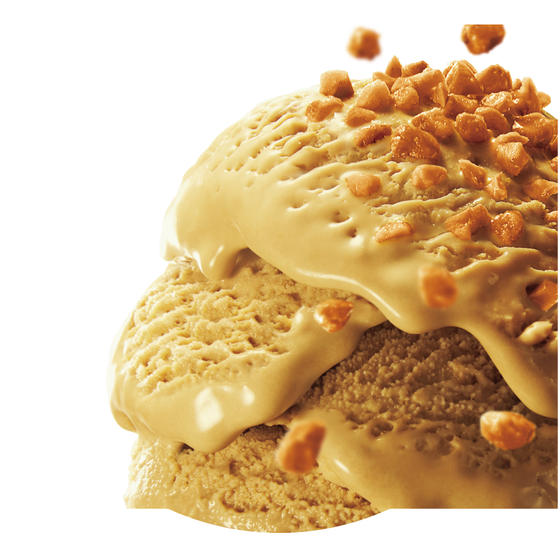 ①濃厚なキャラメルアイスに、キャンディーコートしたヘーゼルナッツをトッピングしました。