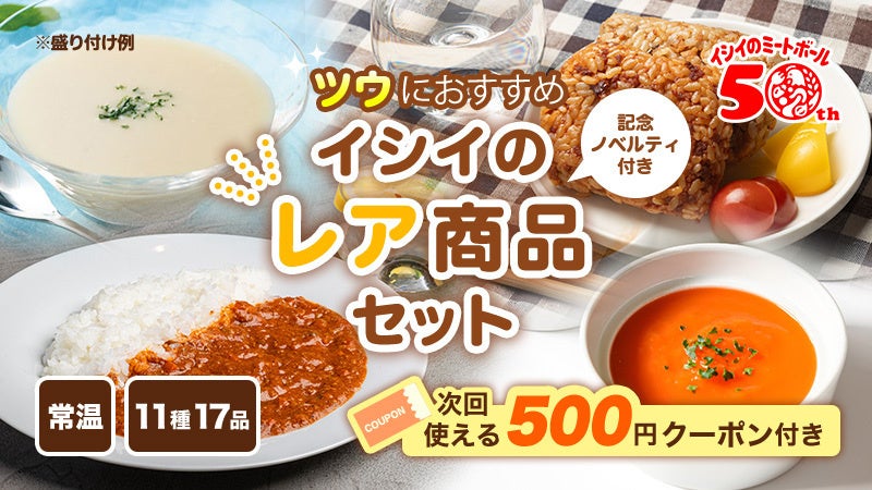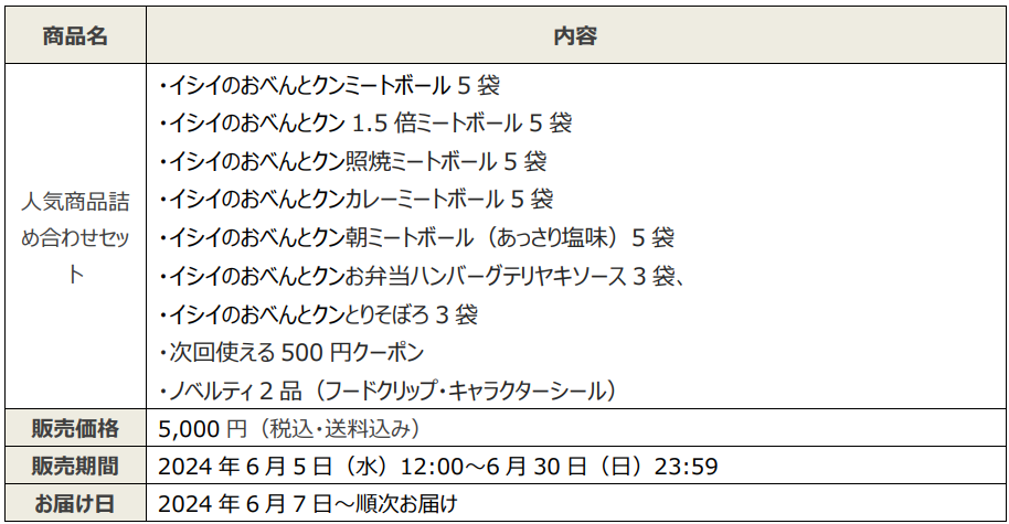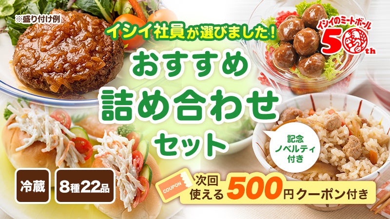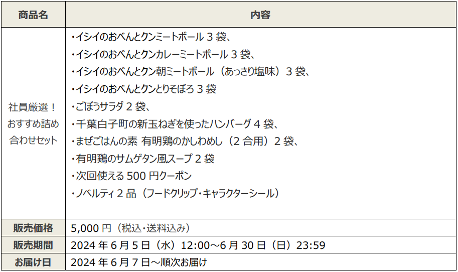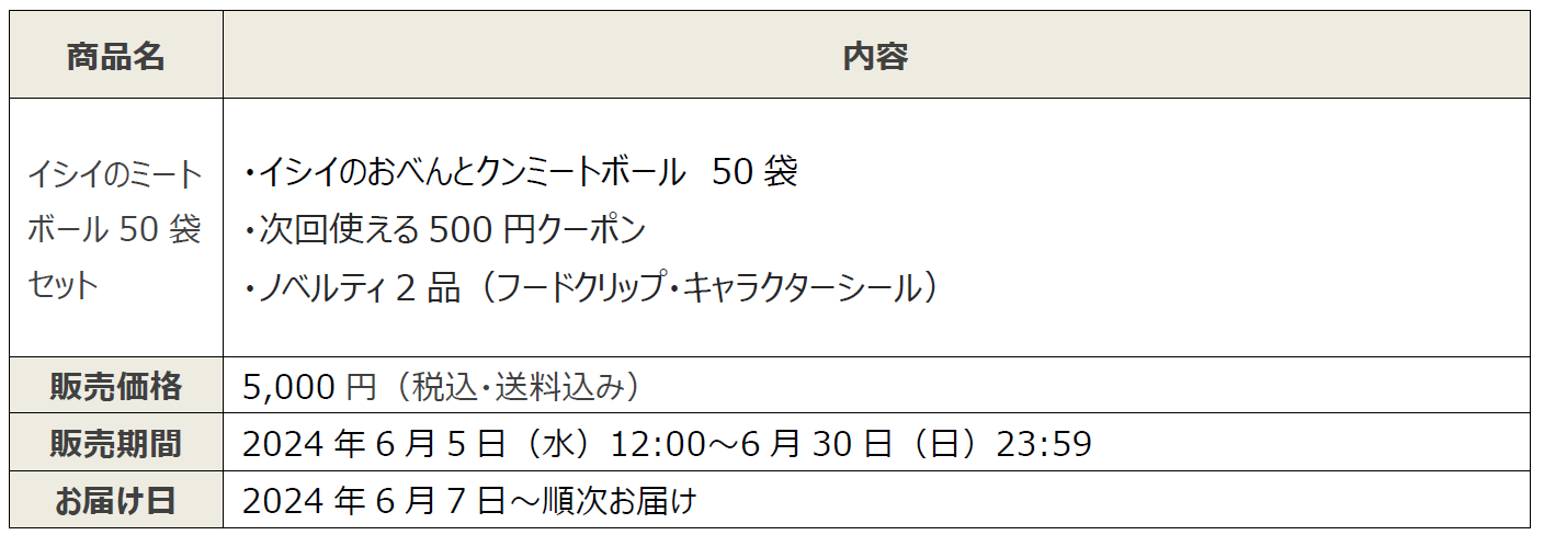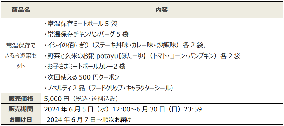 イシイのオンラインストアでは、2019 年6 月のオンラインストアリニューアルから4 年。リニューアルを記念し、毎年6 月に「周年祭」を行っていましたが、今年は「感謝祭」と題し限定セット販売のキャンペーンを実施します。石井食品の看板商品である「ミートボール」の発売50 周年イヤーであることから、50 周年の「5」にかけて、5 種類の記念セットを各5,000 円で販売。各セットには、記念のノベルティ(シール・フードクリップ)をプレゼントいたします。次のお買い物に使用できるクーポンなどお得が詰まった記念セットをぜひお買い求めください。人気のミートボールをはじめ、全国各地の 農家の皆さまと一緒に開発したハンバーグやスープ、まぜご飯の素など、多種多様な商品をご用意しております。 今年は、石川能登を震源とする地震から始まり、不安な思いを抱えている方も多いかと思います。弊社で取扱っている⾧期保存可能な非常食にも多くの注目をいただきました。