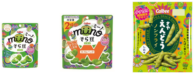 2017年に発売した「miino」は、おいしく健康的に豆を摂取できる商品として、豆まるごとのおいしさを、いつでもどこでも楽しめる商品です。「そら豆」をはじめとして「黒豆」や「えだ豆」など様々な豆を使用したシリーズ展開をしてきました。1993 年に発売した「さやえんどう」は、「えんどう豆」をまるごと使用したスナックで、独自の製法によるポコポコとした豆型の形状が特長。豆本来のおいしさや栄養を活かした商品として長くお客様に愛されています。