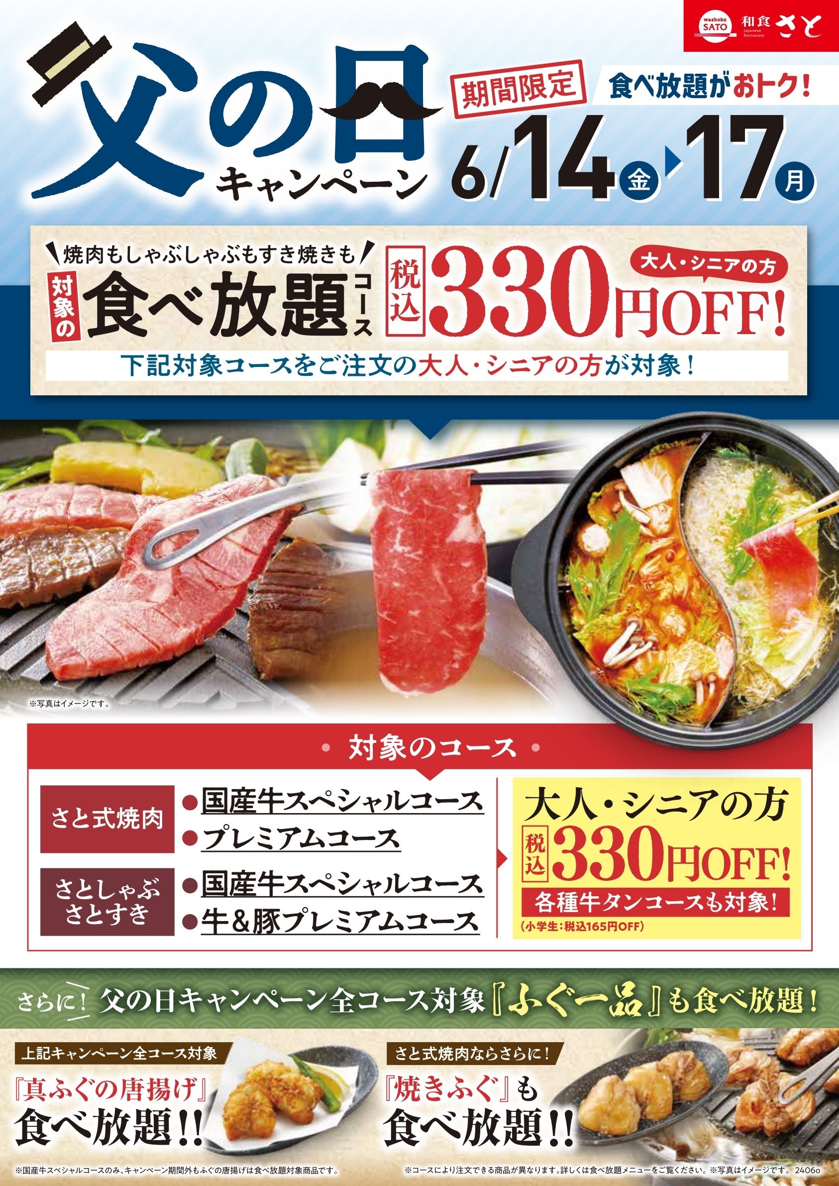国内197店舗を展開する「和食さと」では、6月16日(日)の父の日に合わせて、さと式焼肉/しゃぶしゃぶ/すき焼き食べ放題がお得にご利用頂ける「父の日キャンペーン」を今年も開催します。