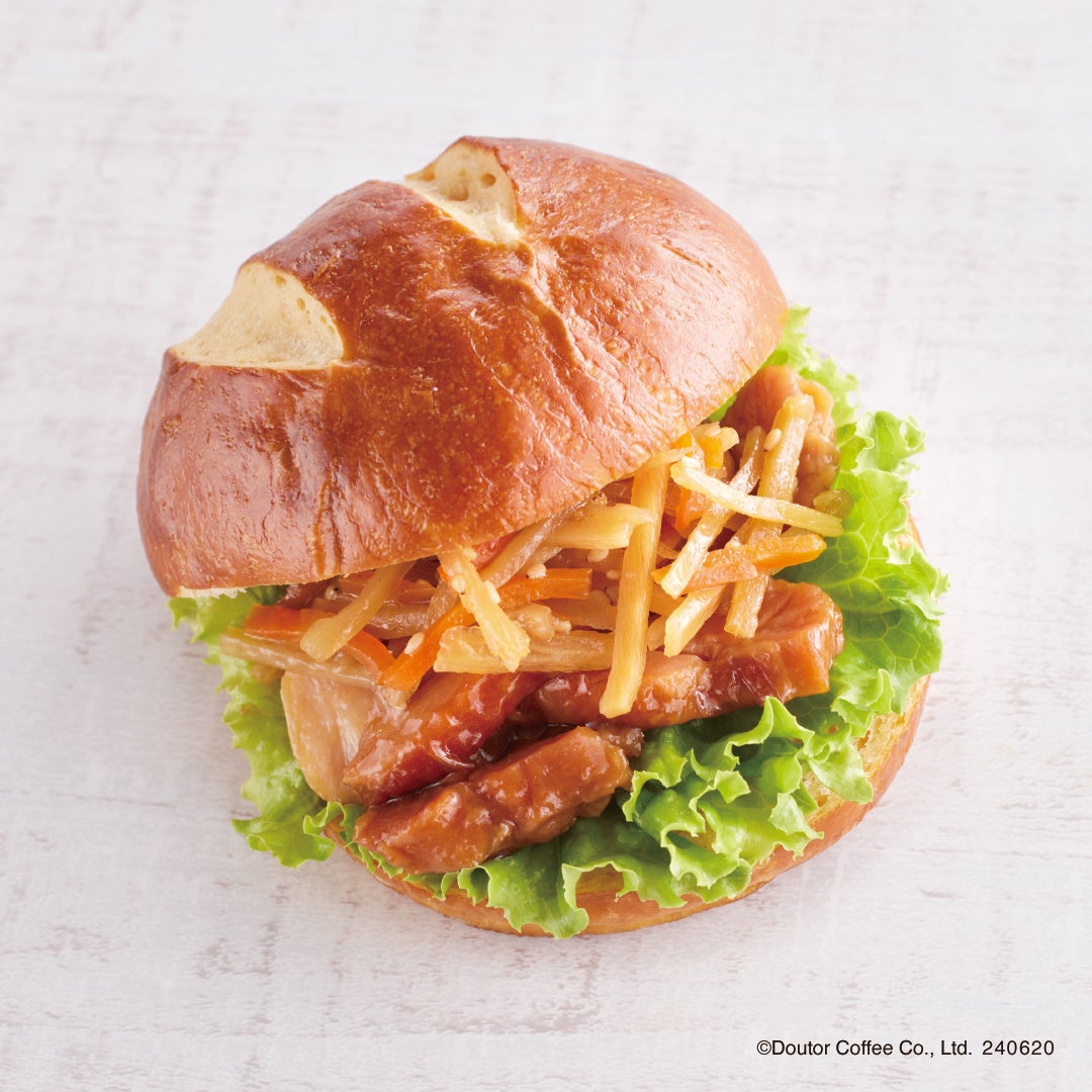 甘辛いてりやきソースを絡ませたチキンとシャキシャキ食感のきんぴらごぼうを、もちもちのプレッツェルバンズでサンドしました。プレッツェルバンズのほのかな甘味と塩味が具材の味を引き立てる、食べ応えのある一品です。