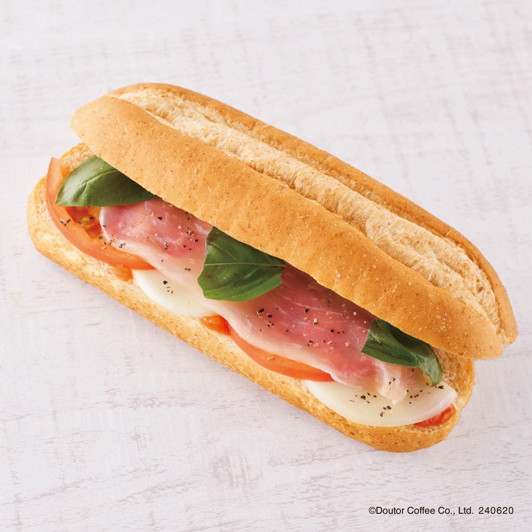 香ばしい全粒粉入りパンに、トマトスライスとモッツァレラチーズ、生ハム、バジルをサンドしました。イタリア産トマトのクラッシュとピューレ、玉ねぎが入ったソースが味わいに奥深さを加えています。パンにオリーブオイルをかけることで、風味としっとり感をプラス。また、ブラックペッパーの爽やかな香りと、岩塩の旨味が味のアクセントになっています。
