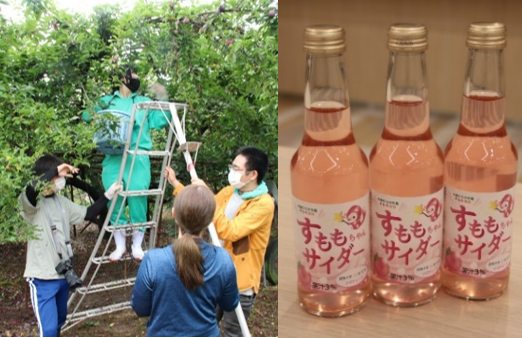 本学農学部は2020年4月に開設。2021年3月、農業振興・食などについて地域課題の解決や地域の活性化を目的に、枚方市と連携協定を締結しました。同市杉地区には古くから「すもも団地」と呼ばれる地域があり、すももは特産品として知られていました。このすももに着目して、学生プロジェクトチームを発足させ、サイダーのレシピを開発、同年秋に「すももちゃんサイダー」として完成させました。香料や着色料は一切使用せず、すもも本来の淡いピンク色で、さわやかな酸味を楽しめます。特産品を再生させたと注目を集め、2022年から枚方市のふるさと納税返礼品にも採用されています。