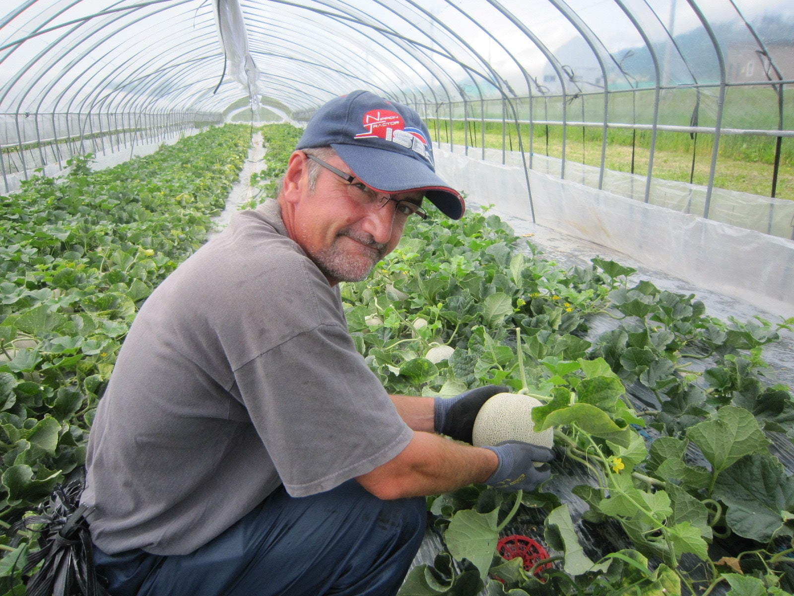 故郷ヨーロッパで習得したハーブ栽培の知識を生かしてメロンや西洋野菜を育てています。農薬8割減の水田の稲ワラを活用した自家製堆肥などを用い、除草剤を使用せずに栽培。株間を通常の栽培基準より広めに取り、ストレスフリーな成長を促すことで大ぶりのメロンを栽培しています。赤肉メロンは、爽やかなオレンジ色の果肉が特徴。とろけるような甘さときれいなネットが人気です。