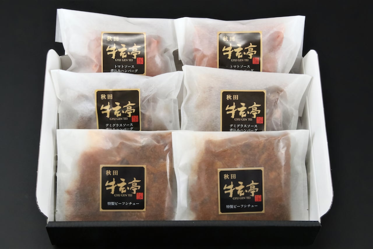 人気商品の「ビーフシチュー」と「牛玄亭ハンバーグ」がセットになりました。「ビーフシチュー」は、低温調理で4時間かけてじっくり煮込まれており、トロっとした大きなお肉の旨味と食感は一度食べたらやみつきになります。「牛玄亭ハンバーグ」は、日本ギフト大賞2019秋田賞を受賞。2種の特製ソースは仕込みに3日間かけて手作りしています。ちょっと贅沢なお肉料理のセットは贈り物にもぴったりです。
