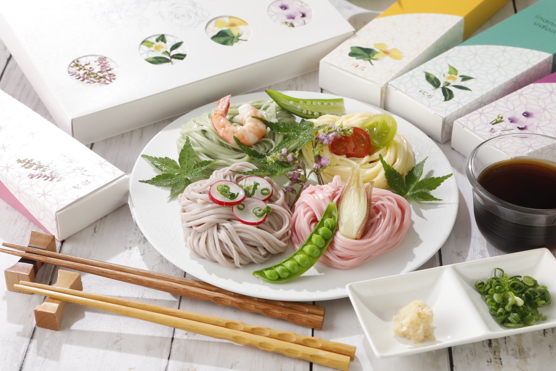 夏の贈り物に、秋田の特産物”稲庭うどん”はいかがでしょうか。華をモチーフにした4つのフレーバーの稲庭うどんは食卓を彩る一品です。「紫蘇」「抹茶」「紫芋」「南瓜」のパウダーを練りこみ、鮮やかな色を作り上げました。稲庭うどんののど越しも楽しめる逸品です。また、おしゃれで質感の高いパッケージも華にこだわったものとなっています。